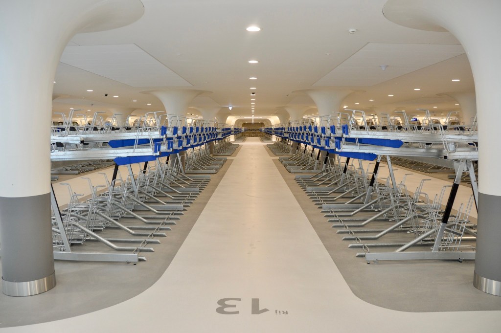 The garage features a sleek white design with curved columns and double-stacked bicycle rows, and artwork, including pieces by the late Lex Horn, adorn the walls. Both garages have direct access to Amsterdam’s Central Station, adding to the convenience for commuters. A series of electric ramps provide easy access to and from the garages for cyclists. The Stationsplein garage also features a shop where cyclists can buy accessories or get their bikes fixed.