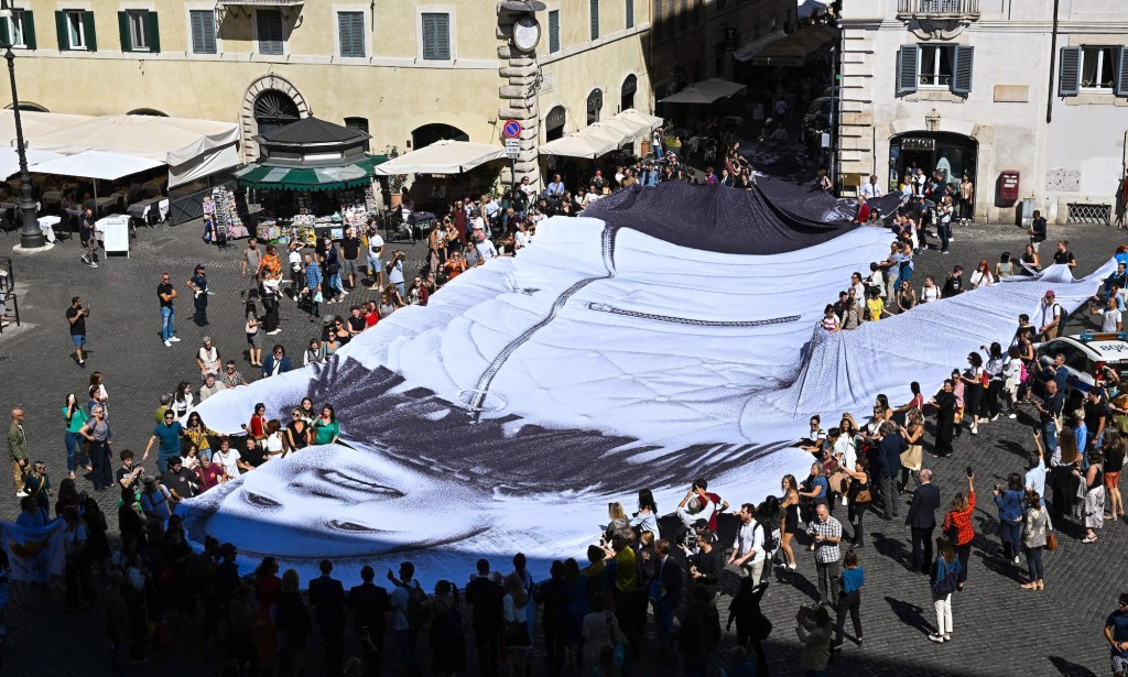 “I was really trying to capture that moment of lightness and innocence of all children before the weight of the world falls on them,” he told The New York Times. Earlier that year, he’d recruited 1,000 volunteers to hold giant banners printed with portraits of five refugee children from five countries. “It looks like those kids are just playing together, like there are no borders,” he said.