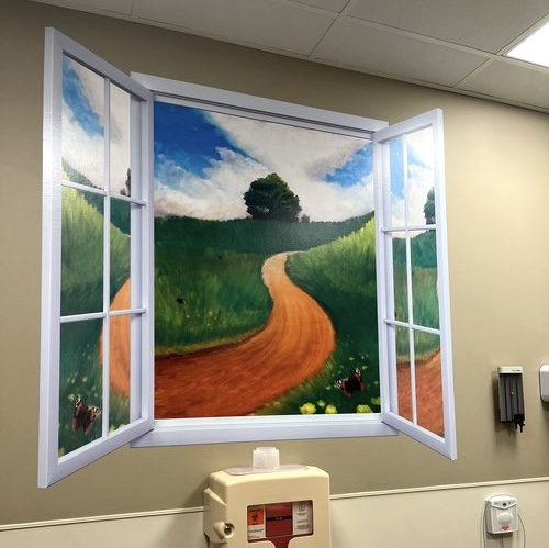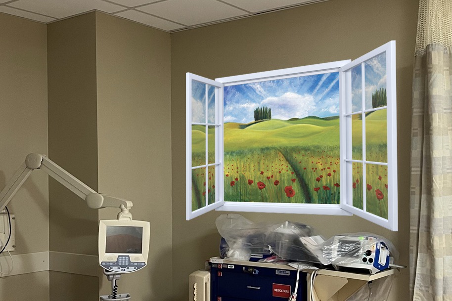 At Roswell Park Comprehensive Cancer Center in Buffalo, New York, patients receive lifesaving care in the institution’s treatment rooms. And in some of those rooms, behind the medical equipment and practitioners bustling in and out, a special sort of health care intervention works its own magic: bright, inspirational murals depicting wide open windows to the outside world.